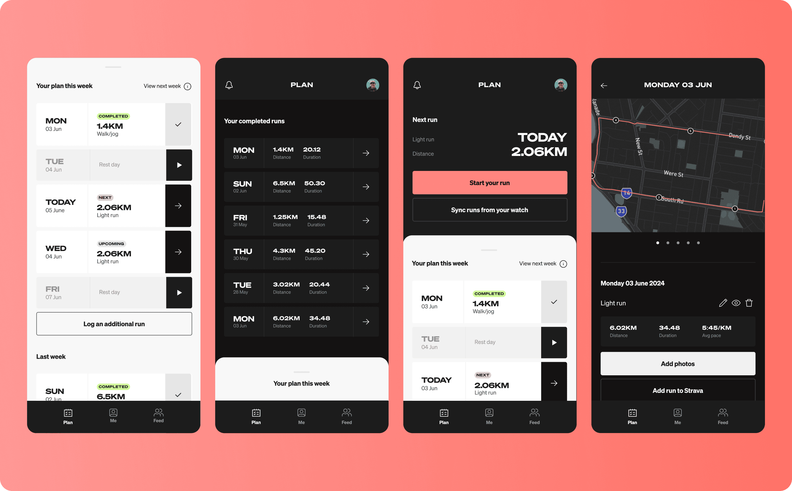 We've enhanced the UI to make running more accessible and convenient. Runs are front and centre, keeping users focused on their daily plan. Instructional videos are easy to access for support, while a gamified experience encourages users to log activities and keep progressing.