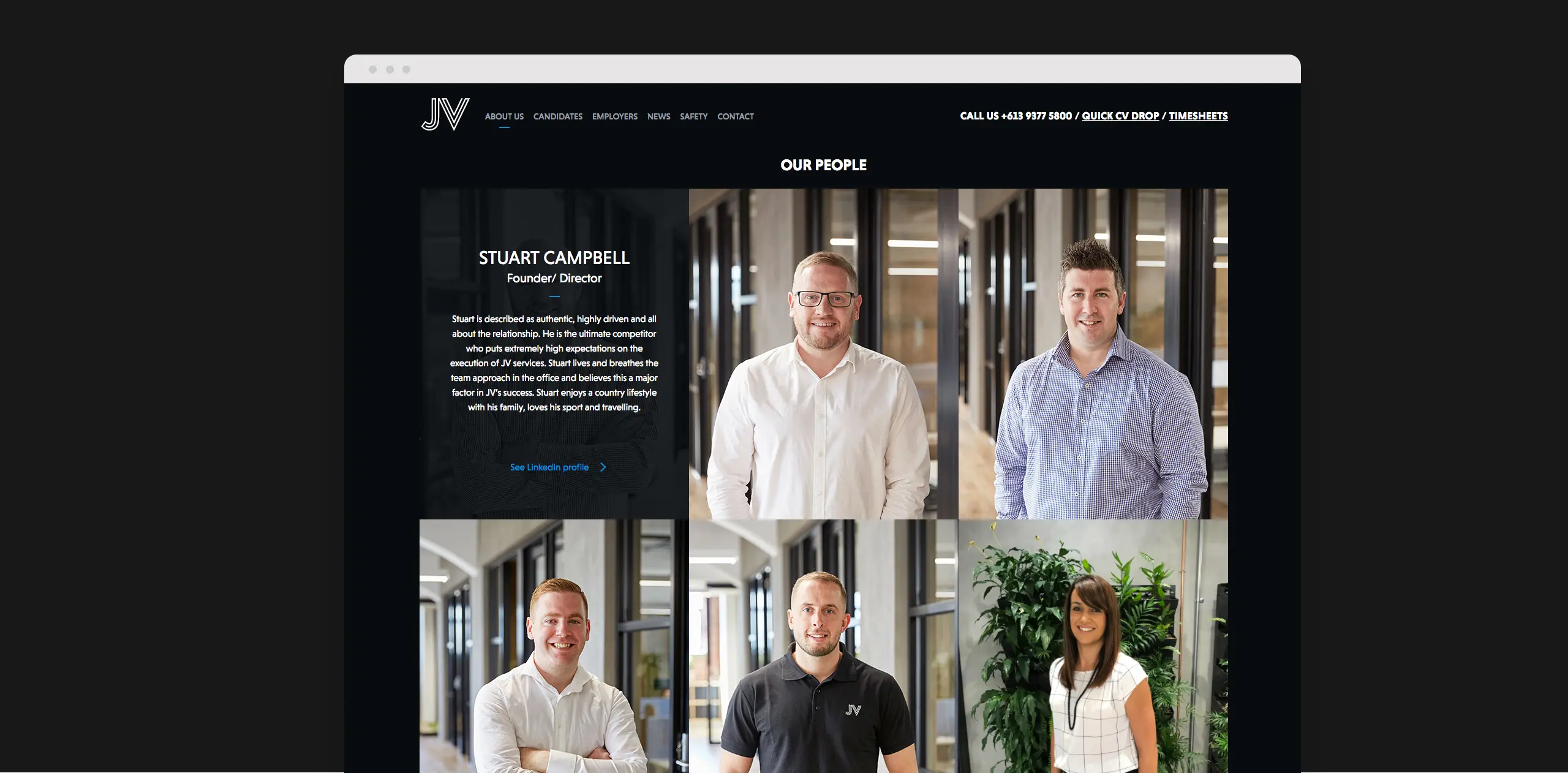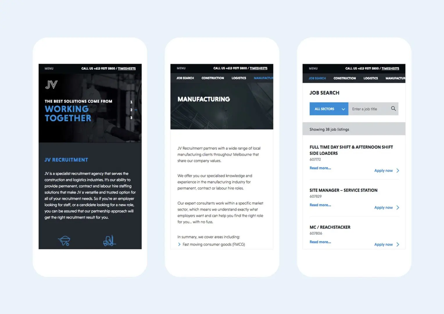 The primary revamp of the site involved simplifying and enhancing the overall user journey and experience to increase conversions, including driving users to contact JV by including strong Calls To Action. Additional design features highlighted their credibility and unique offering to stand out amongst competitors, and easy CV drop off for potential candidates.