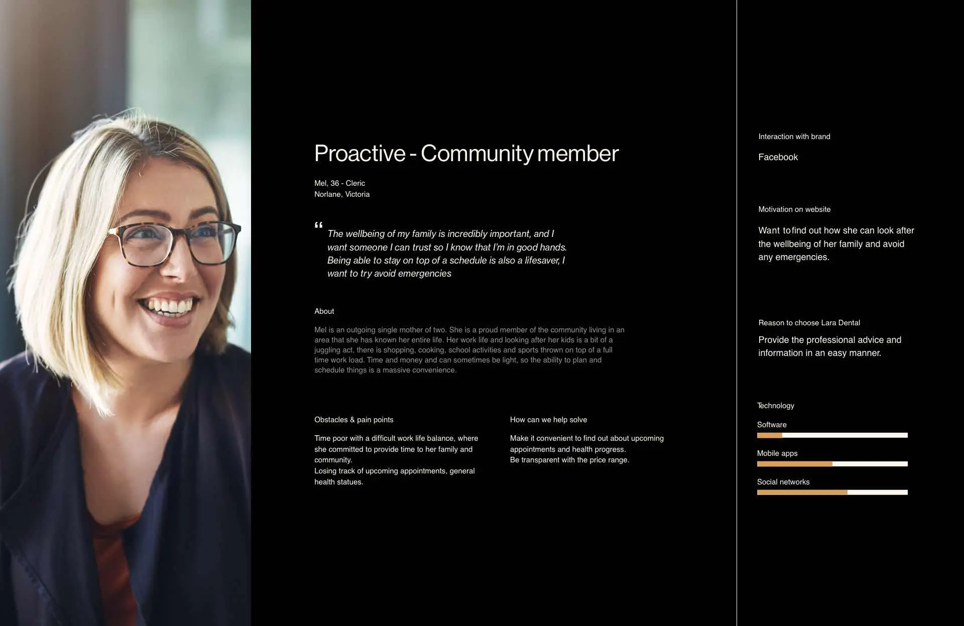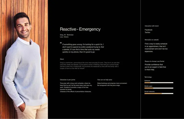Our research involved extensive competitor analysis, involving local and global leaders in dentistry and then the broader health industry. Along with research into their local community which allowed us to identified three core personas types.