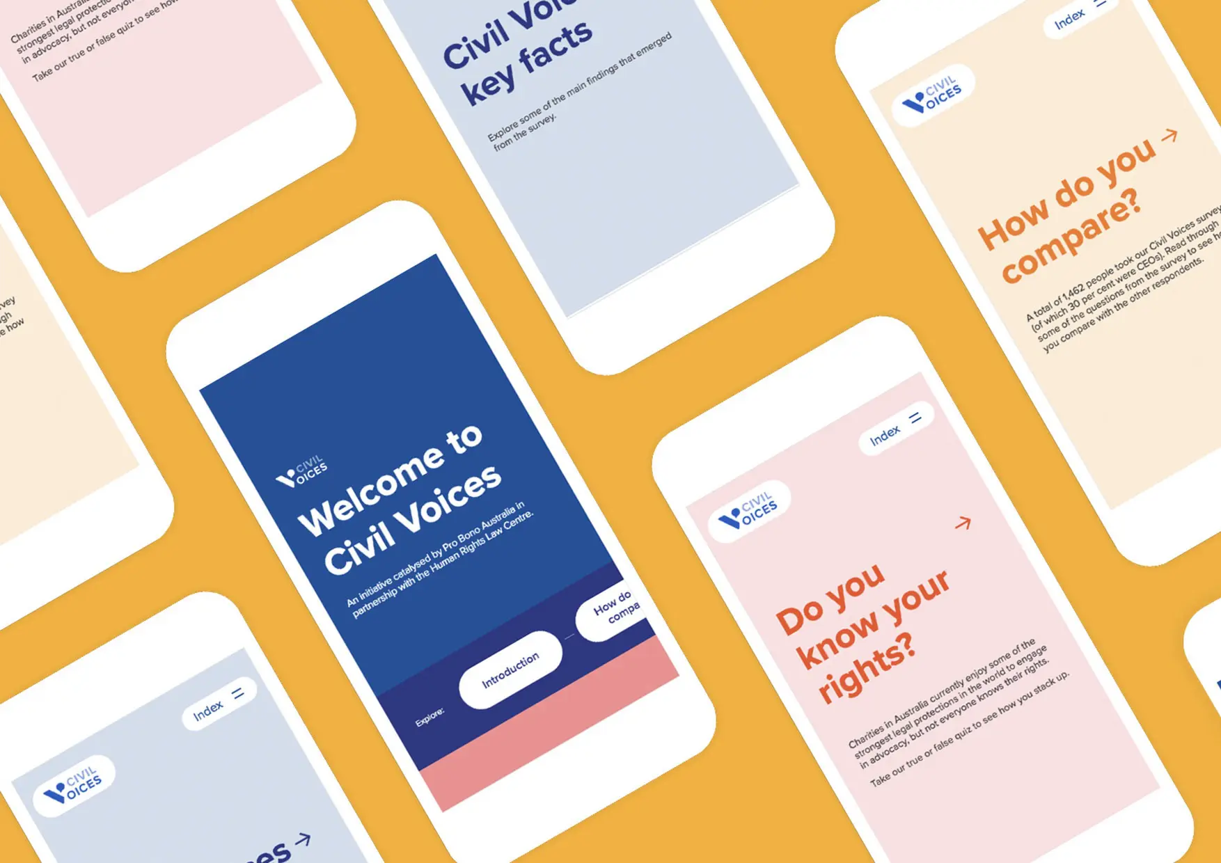 Taking inspiration from the passionate, fun personalities behind Civil Voices and Pro Bono, along with the data and information provided in the survey, we created a microsite and publication design equipped with colourful branding and illustrations. We wanted the designs to create a vibrant and exciting feel in order to break up the heavy content and create a design for the data which is unique.