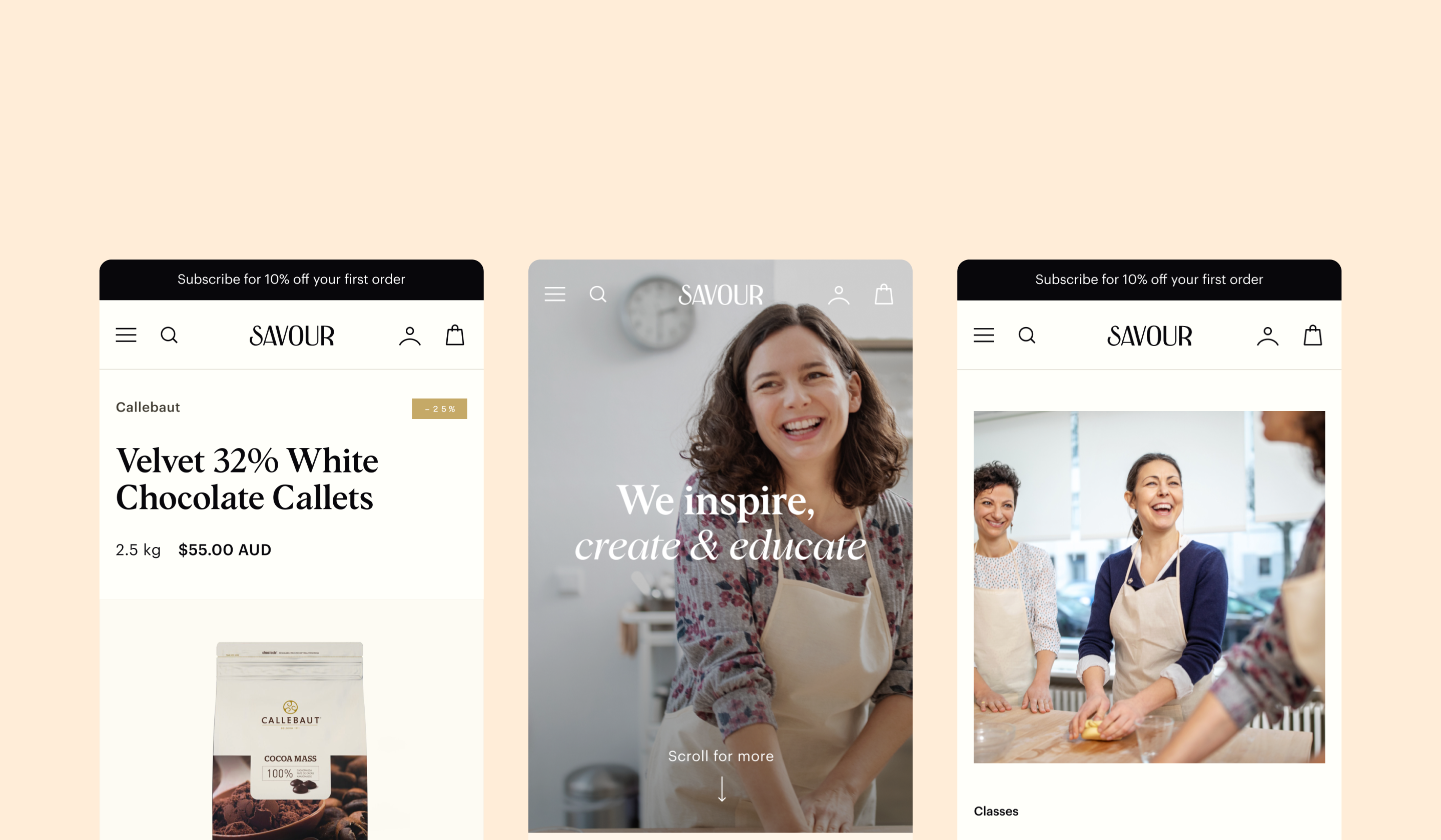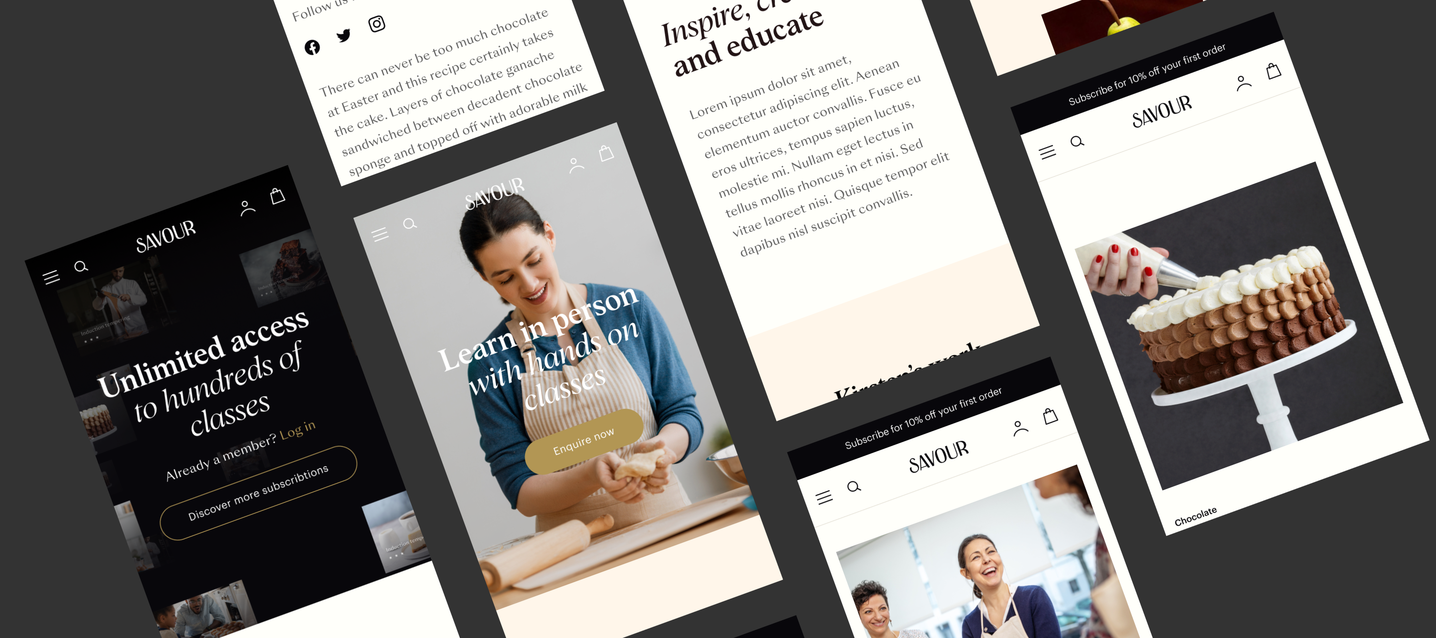 The combination of stylish typography, optimistic photography and a classy colour palette enhances the experience and conveys the professionalism of Savour School.
