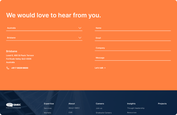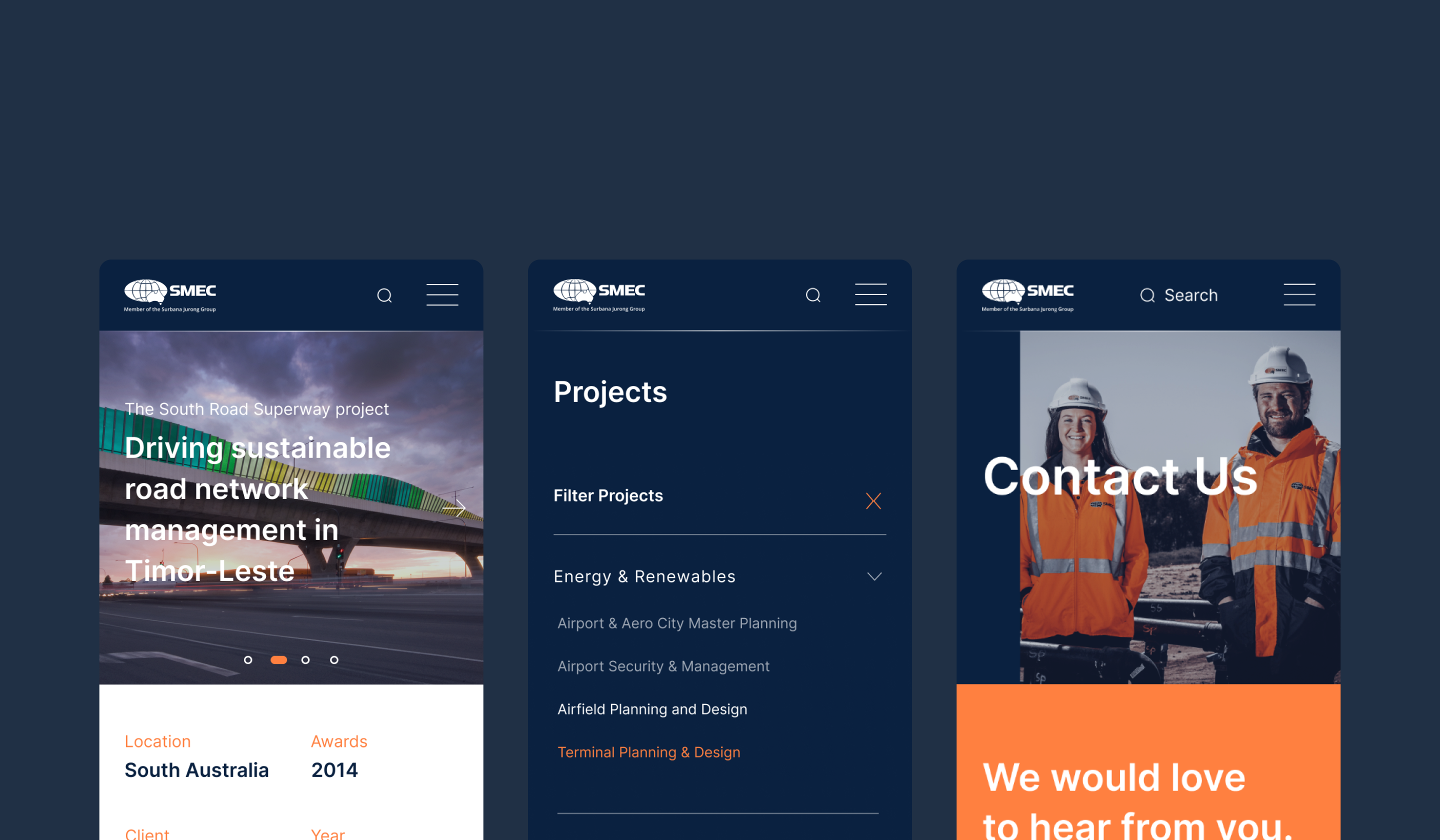Smec had recently rebranded its print collateral, but their digital presence lacked cohesiveness. Bringing the same high-quality print feel to their website, as well as closing the gap between their print and digital presences. We also designed an intuitive mega menu to organize the site’s information architecture, which had become cluttered over time. There are various groups of users visiting the site, so understanding each individual user was key to displaying content and CTAs that appealed to them, we displayed SMEC’s credibility and reputation clearly through case studies and leadership pages.