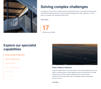Elevate SMEC’s digital experience as the global tier-one provider of transport and energy infrastructure service. On the current site, it is difficult to understand SMEC’s true value proposition and updated branding. Due to the linear site architecture, it is difficult for users to find information. The service offering needs to be simplified. SMEC’s updated brand statement needs to be reflected and aligned with its online presence. Since the user interface lacks aesthetics, it is difficult to navigate. To elevate the experience, SMEC should introduce modern design elements to its outdated digital appearance.