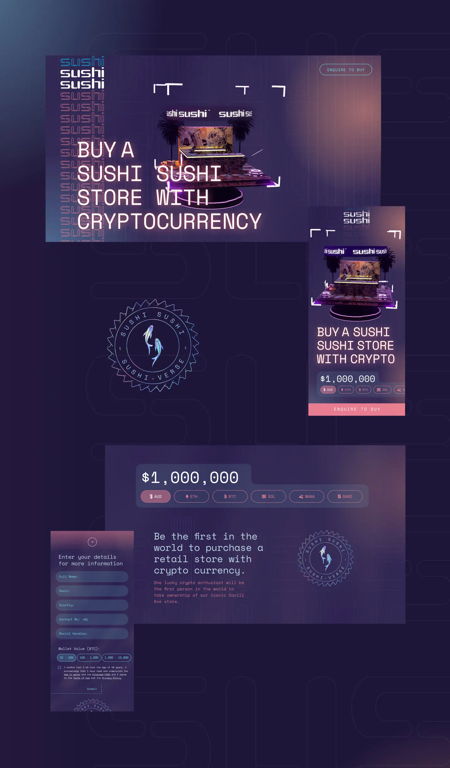 The landing page was designed with a mobile first approach to create a seamless experience for all users that saw the animation on Sushi Sushi’s socials and landed on the page from there. We mixed holographic animated textures, glitch effects, glowing typography and a galaxy-inspired colour palette of purples and pinks to keep the design inline with the same futuristic aesthetic.