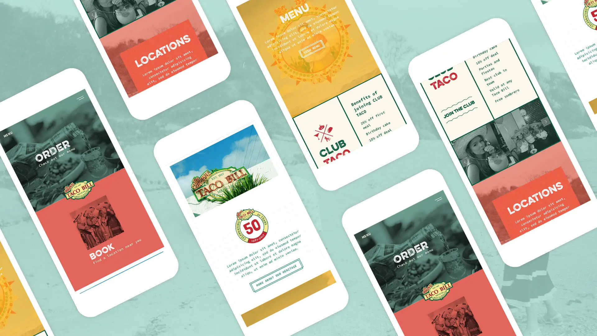 The digital presence reflects the rich history of the Taco Bill brand, whilst engaging customers with the nature of sharing food and energetic Mexican colour. We used connecting, honest, relaxed imagery to reflect groups of people sharing an experience, or taking pride in running a business together. By doing this we also aligned the brand's digital presence with the originality, comfort and energy of the restaurants (allowing an opportunity to reinvigorate the brand as a whole) and present information about the brand's grassroots for the audience to connect with.