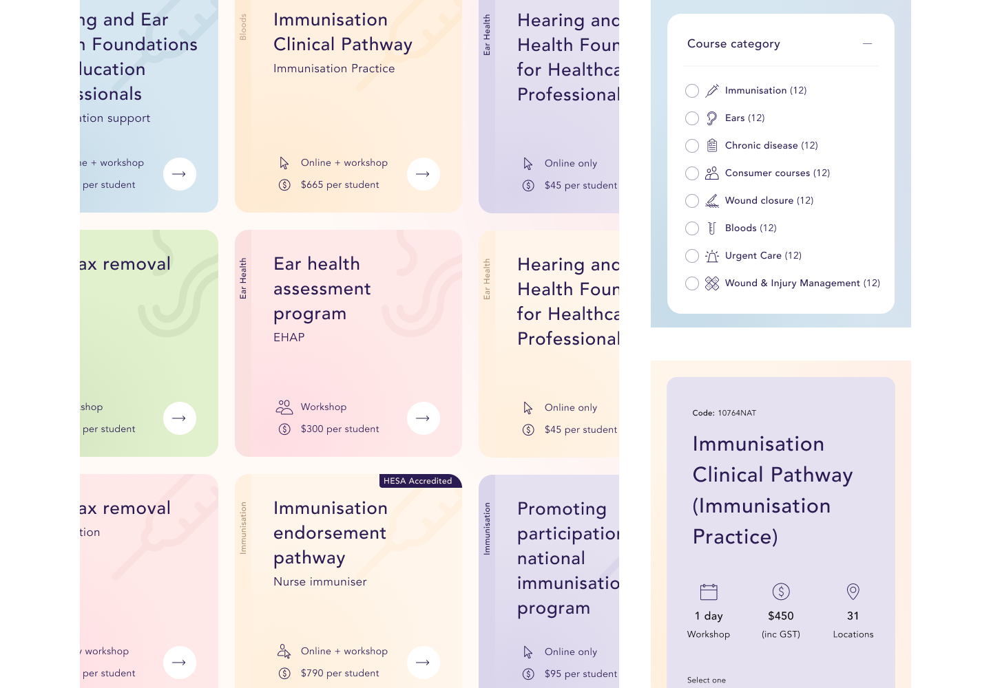 Course discovery was overhauled—creating a consistent journey for users. Each category was colour coded and given a unique icon. The course tiles were updated to contain the most sought after information before the user committed to a tap through to the course page.