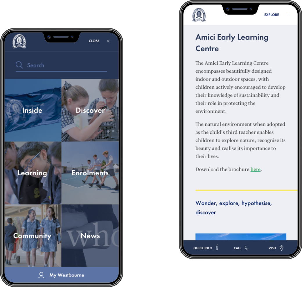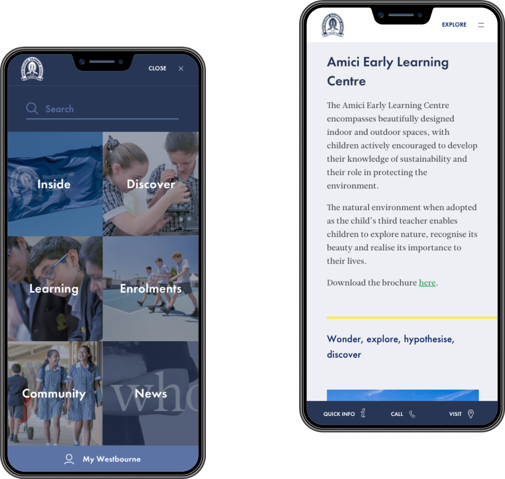 Westbourne are known for their diverse, inclusive and community focussed approach to private schooling. We created a digital presence to house their evolving brand and give students, staff, parents, alumni and stakeholders, a new digital identity. With intuitive navigation considering user flow and motivations, we created a tool for the community that aligned to Westbourne’s core values.